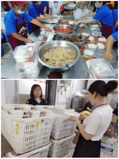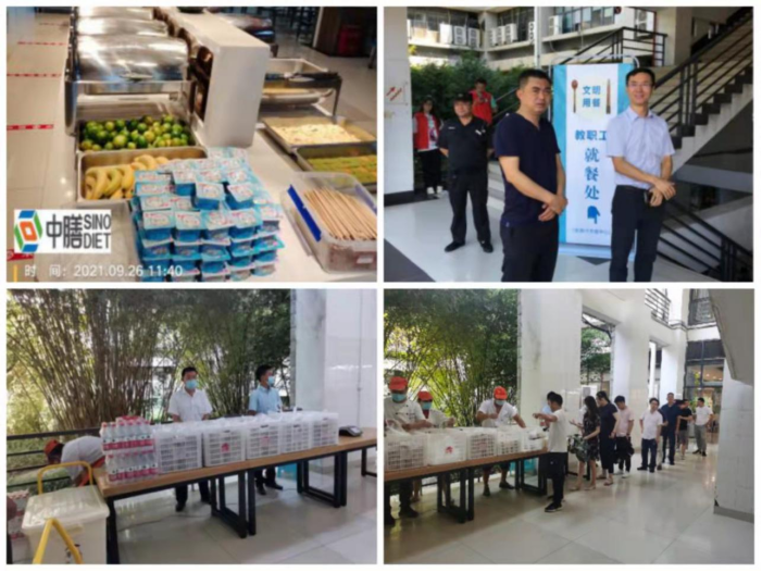 迎新期间为学校工作在迎新第一线的老师和志愿者们提供营养盒饭,解决了他们的用餐问题;军训期间南一食堂为教官们提供丰富的一日三餐,由于军训期间突然降温,为了帮助同学们预防感冒,南北校区各食堂为同学们准备了免费的红糖姜汤水;9月26日在我校举行全市职业院校“双高计划”“双优计划”项目建设工作推进会,参会人员较多,教工食堂场地有限,食堂紧急协调,保障参会代表与教职工正常用餐。