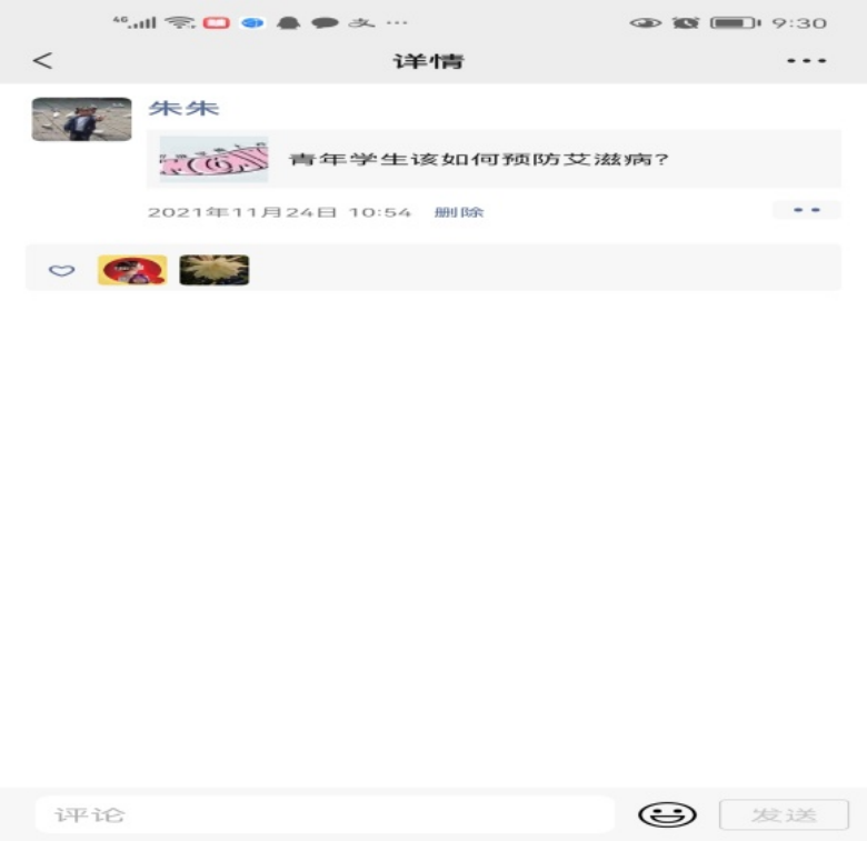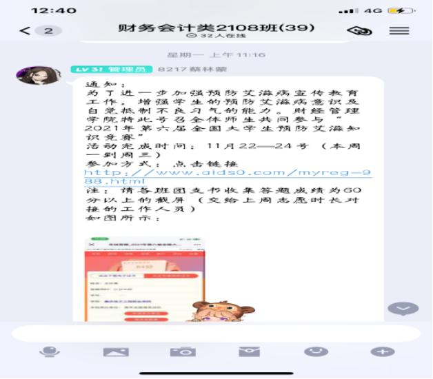 按照沙坪坝区疾控中心的要求,在2021年11月24日至12月1日防治艾滋病宣传期间,卫生科LED屏滚动播放艾滋病防治宣传语 “生命至上 终结艾滋 健康平等”;在卫生科活动现场设置咨询服务点,填写不记名“艾滋病防治基本知识”问卷调查表105份,100%知晓率为43.8%;12月1日8点至12点电脑不间断视频播放“青少年性健康和艾滋病防治系列课程一、二”,并为就诊、咨询的师生讲解防治艾滋健康知识,讲解避孕药具机免费领取避孕套及避孕套使用方法;制作宣传栏一期、宣传海报4张、易拉宝一个;QQ、微信转发“青年学生如何预防艾滋病”共计7次;本次活动发放宣传折页共计1052张。