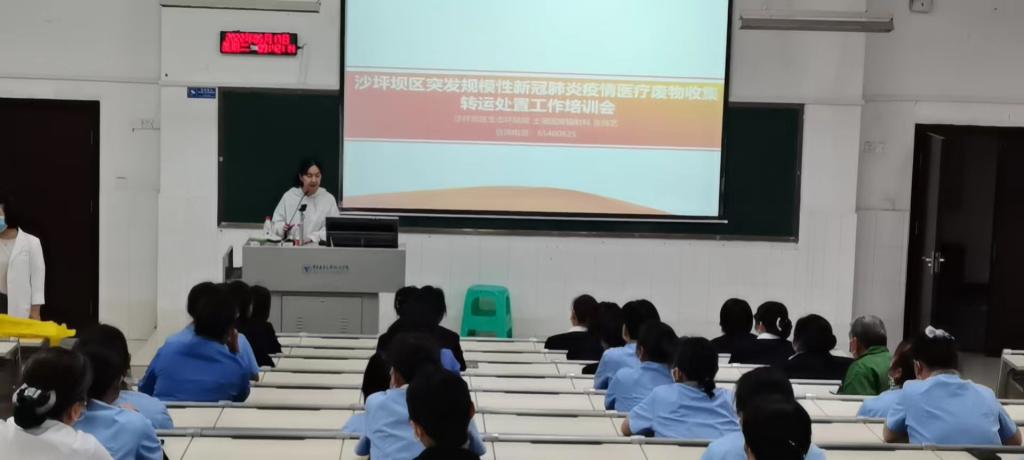 为积极应对校园可能出现的新冠肺炎疫情,贯彻落实《重庆市中心城区突发规模性新冠肺炎疫情医疗废物及生活垃圾收集转运处置实施预案》,科学、精准、依法应对校内突发规模性新冠肺炎疫情医疗废物及生活垃圾收集转运处置工作,经学校新冠疫情防控领导小组研究,于2022年5月17日上午9:30邀请沙坪坝区生态环境局和沙坪坝区卫生健康委员会在我校教学楼7-208对卫生科医疗废物管理人员、大正物业负责人及医疗废物处置相关工作人员进行突发规模性新冠肺炎疫情医疗废物及生活垃圾收集转运处置培训。