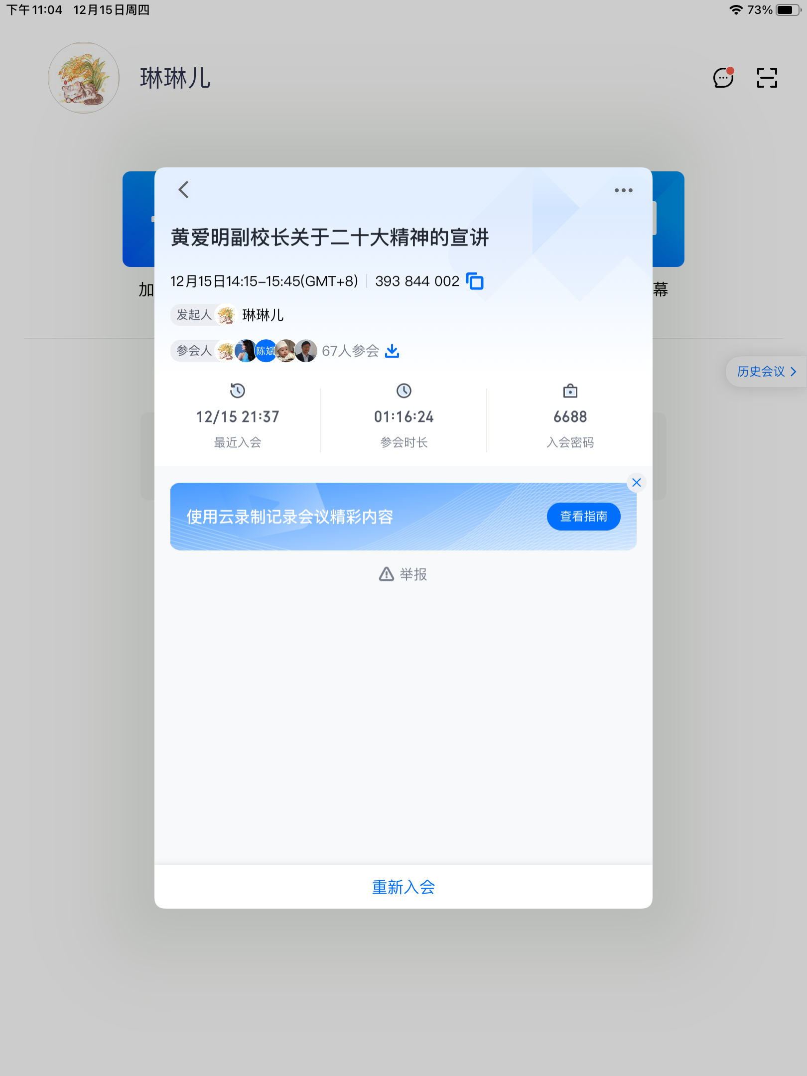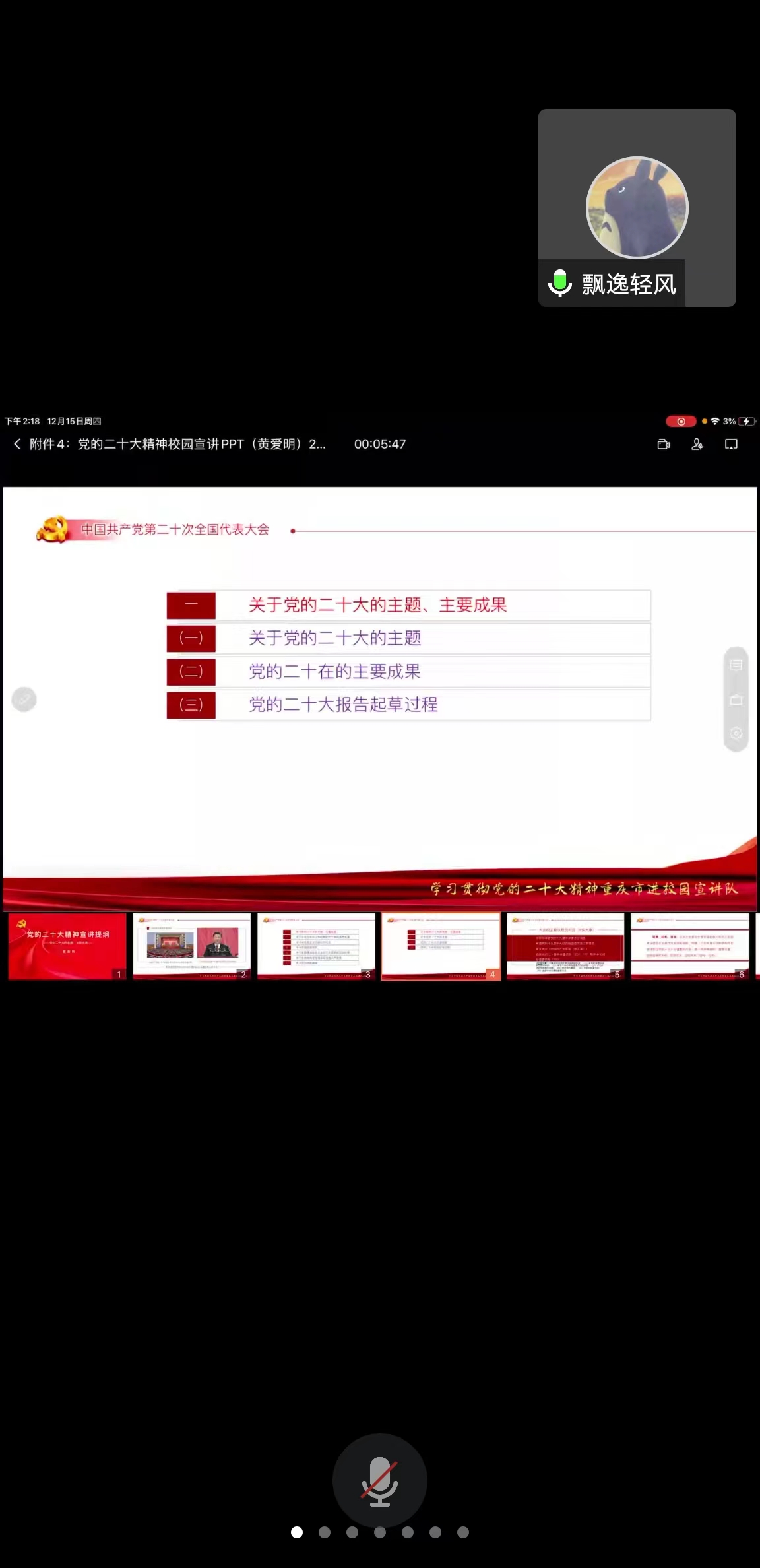 2022年12月15日下午,副校长黄爱明同志为后勤保障处党支部和建筑与材料学院党总支开展党的二十大精神宣讲,宣讲的主要内容是“党的二十大的主题和主要成果”。为了减少聚集,本次宣讲在腾讯会议线上进行,师生党员共计67人参加。