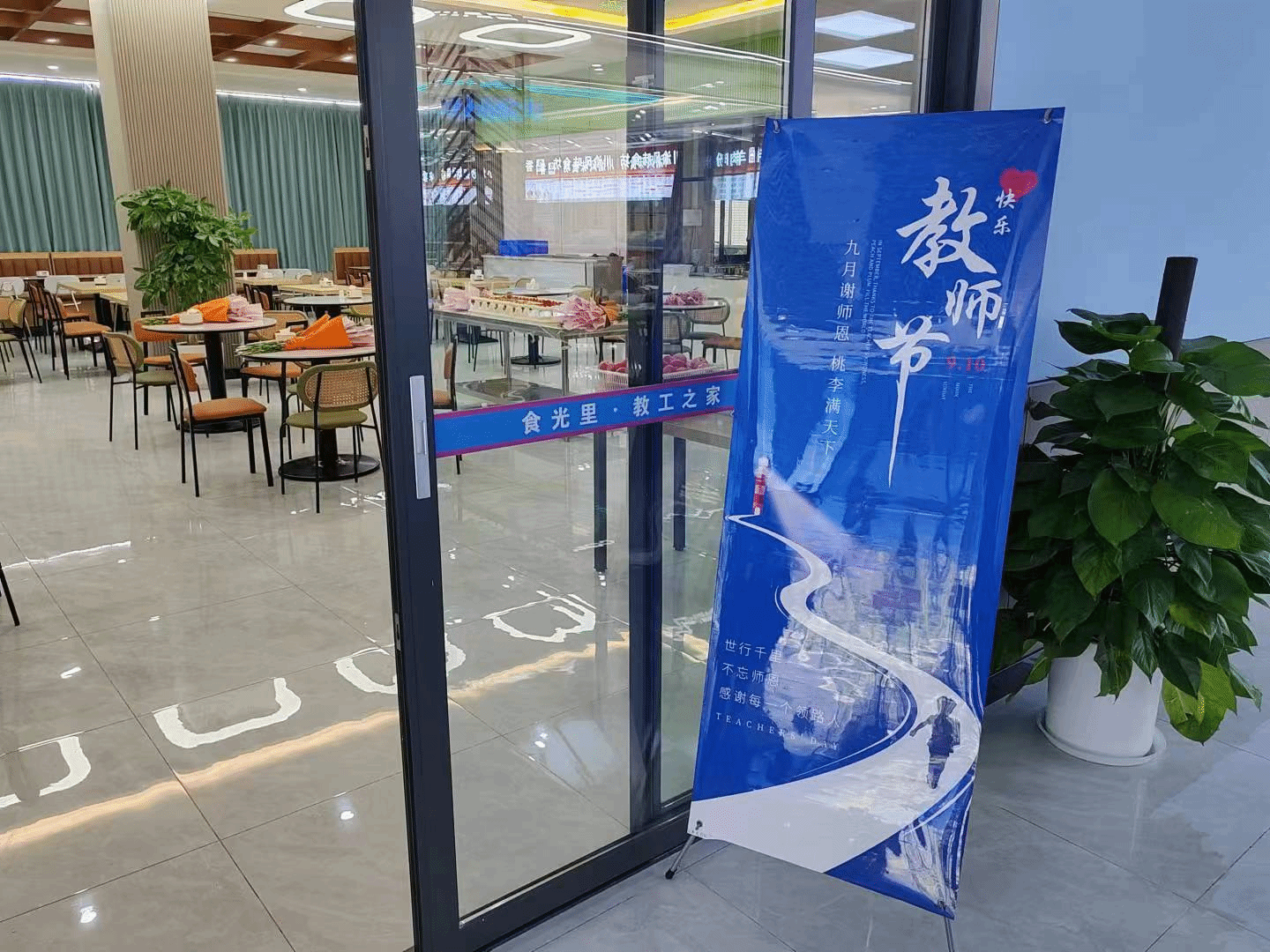 首先映入眼帘的是观兰园教工餐厅门口展架上的“礼遇教师节—祝全校教师们节日快乐!”和桐映园教工餐厅门口展架上的“教师节快乐!—九月谢师恩,桃李满天下!”,浓郁的节日气氛感染了每一位前来就餐的老师。