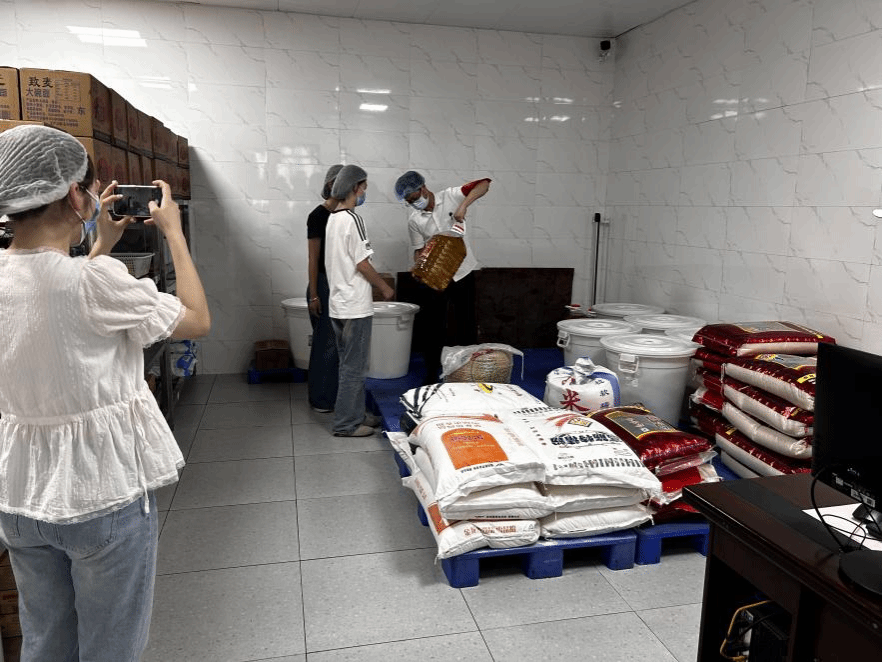 步入桐映园一、二、三食堂的库房区域,规范化的管理细节令人印象深刻。主食库内,原料隔墙离地整齐码放,抽风机、空调与温湿度监测仪协同运作,为食材提供恒温恒湿的存储环境;副食库中,调味品分类清晰、标识明确,严格执行“先进先出”原则,杜绝过期隐患。学生代表还深入后厨加工区,观摩从食材清洗到烹饪的全流程操作。洁净的操作台、分类明确的刀具案板、穿戴规范的工作人员,无一不彰显后厨管理的严谨与专业。