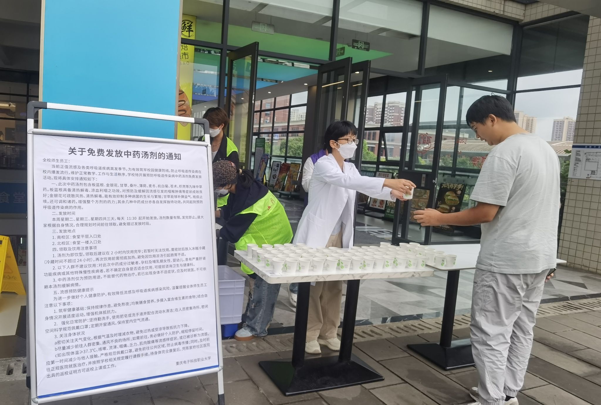 10月14日至16日,在校医指导下,观兰园二食堂、桐映园一食堂为师生规范熬制中药汤剂,每日上午11:30起,校医与志愿者分别在南北校区食堂入口处设立发放点,将汤剂分装成杯,有序发放至师生手中。
