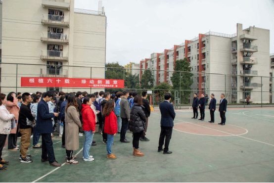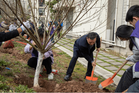 校长聂强在致辞中讲到:"厚土育新苗,匠心传薪火,植树造林不仅是美化校园的生态工程,更是培根铸魂的育人实践。每一棵树苗都承载着重电科大人对绿色发展的追求,对美好未来的期许!"他号召师生以植树为起点,将生态文明理念融入育人全过程,让"绿色基因"厚植于校园文化土壤。现场掌声雷动,师生热情高涨。