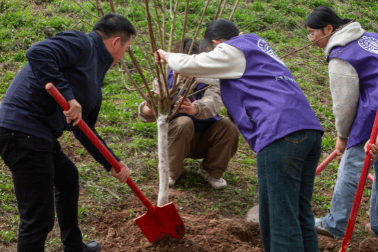 随着聂强校长宣布活动开始,师生们分工协作,挥锹铲土、扶苗培根、提桶浇灌。校领导们躬身示范,聂强校长一边娴熟培土,一边向学生传授技巧:"土要压实,根才能扎稳,为人处世亦如此!"龚小勇副书记、黄爱明副校长、刘洪光副校长分别带领同学种下新苗。经过两小时奋战,春风拂过,60株桃树苗迎风挺立,与师生劳动的身影交相辉映,原本空旷的山坡焕发新生。学生温何燕抚摸着亲手栽种的树苗感慨:"今天的汗水将化作明天的绿荫,我们会像守护专业理想一样守护这片绿色!"