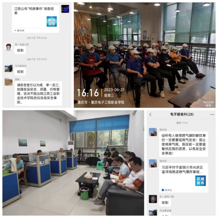 组织各食堂经理学习了《重庆电子工程职业学院关于开展2023年“安全生产月”的通知》、《火灾防控“除险清患”专项行动 工作方案》、《重庆电子工程职业学院关于做好2023年端午节及暑期安全稳定防范工作的通知》等文件,并责令其传达到每个食堂员工,对以上文件及相关安全问题开展学习。